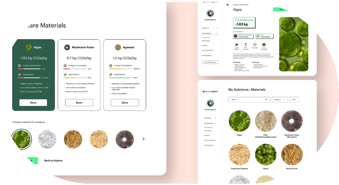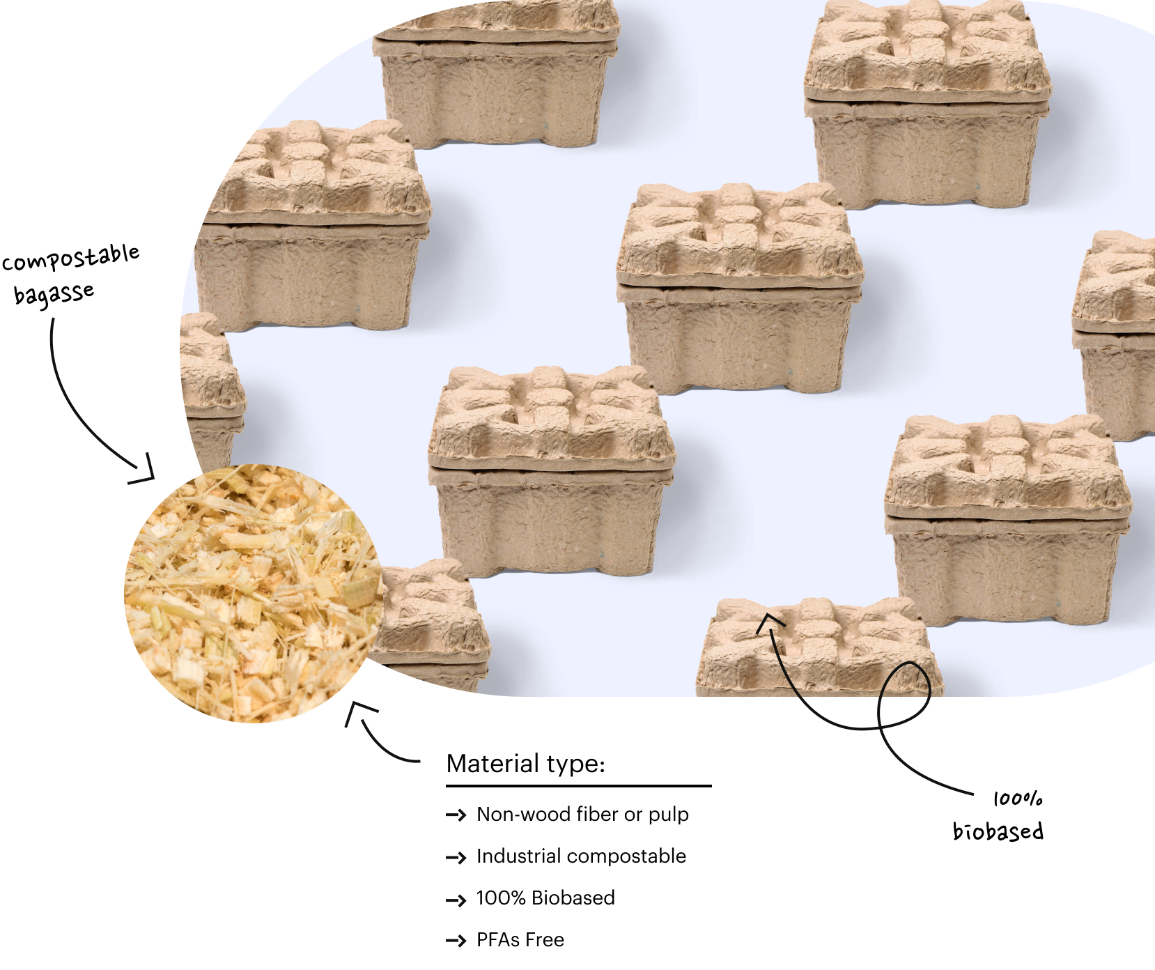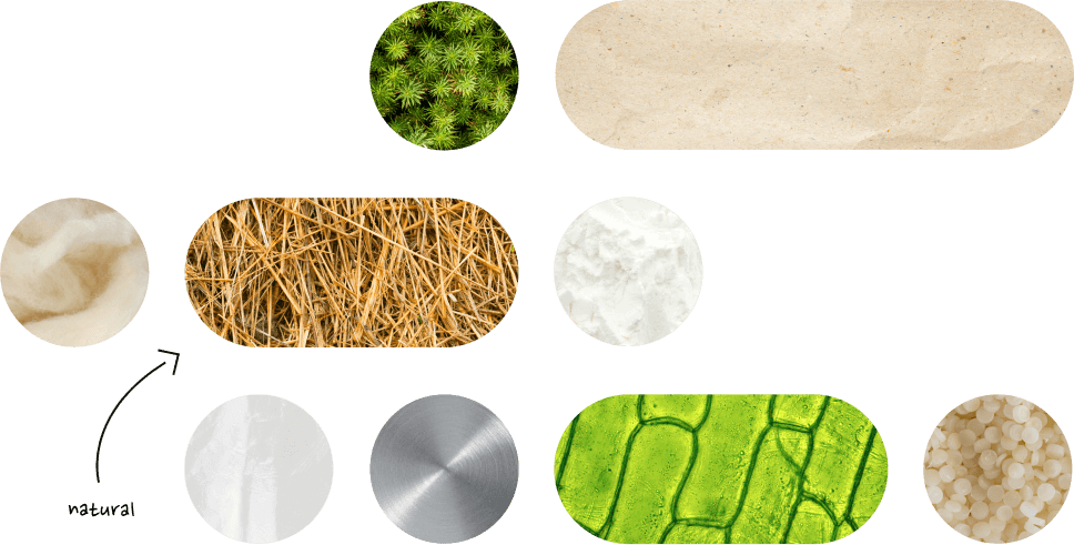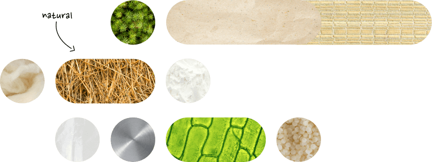 - Innovative materials like wood-free fiber pulp, agwaste, mycelium and algae